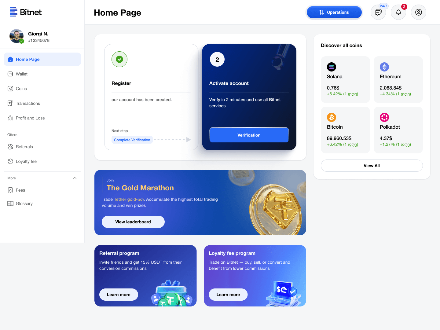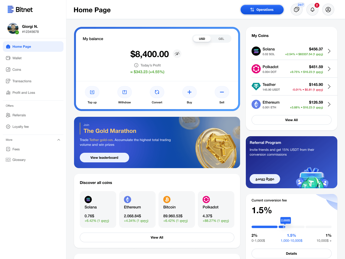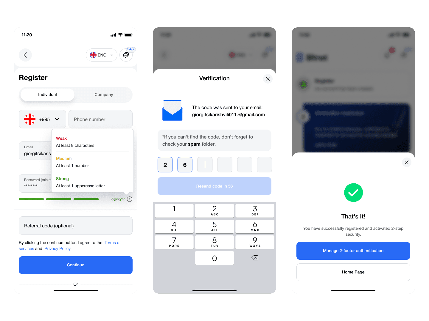 1. Mobile-first, always. The vast majority of our users in Georgia interact with crypto through their phones. Every flow was designed mobile-first — touch targets, thumb-zone navigation, progressive disclosure, and only then adapted up to web. This kept the mobile experience from feeling like a stripped-down version of the web product, which is how most cross-platform fintech apps fail.