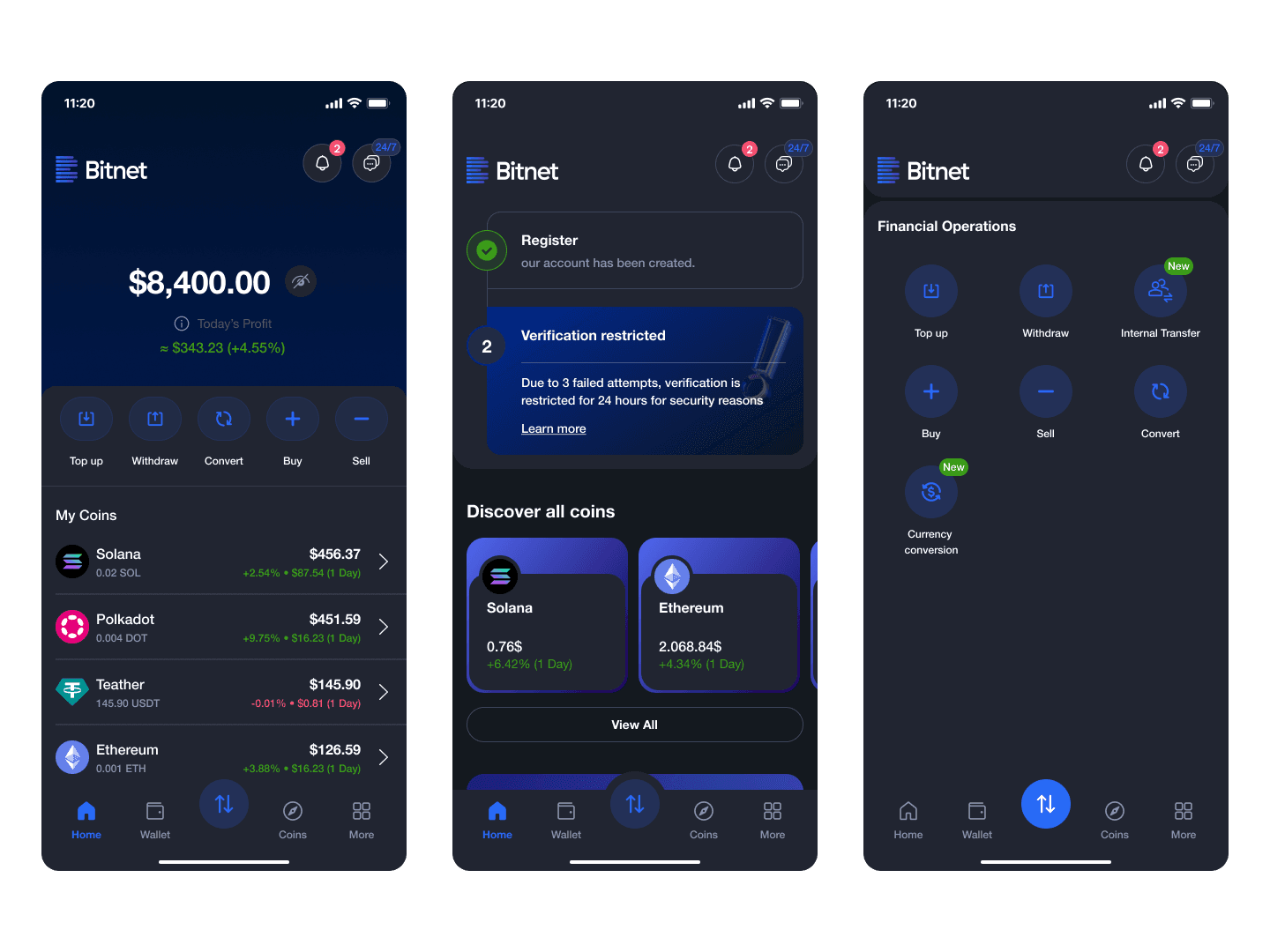 When I joined, Bitnet had a partial design system in place and a redesign of the mobile app and website was already underway. My job was to take ownership of major flows alongside the rest of the design team, push the system further, and ship across all three surfaces - mobile, web, and the internal admin panel, with consistency.